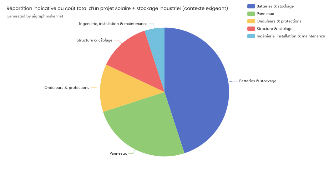 Dans la répartition (basée sur des moyennes de projets commerciaux et industriels en Afrique subsaharienne et en Europe), les coûts de main-d’œuvre et les coûts de gestion de projet (ingénierie, supervision, logistique, documentation, etc.) ne sont pas explicitement visibles, car ils sont intégrés dans plusieurs postes :